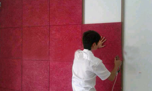 用力邦或多樂(lè)士、典彩乳膠漆加適量的水用噴槍將涂料直接噴在板材上,一般連續(xù)來(lái)回兩 三遍即可。保持所有地方都能夠均勻上色且不要噴的太厚以免影響吸聲效果。